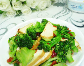 烧锅倒油烧热,下入焯好的西兰花和切好的香干,搁入适量的剁椒翻炒翻炒。