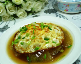 接着,合入煎好的鸡蛋,倒入一些水煮开,煮至冬瓜断生熟软。