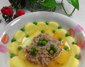 把搅拌均匀的肉末放在玉子豆腐上面,在放些豌豆在豆腐上面。