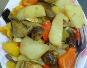 将土豆切成滚刀块,香菇,茄子,青红彩椒掰小块,加入盐橄榄油,黑胡椒粉,辣椒粉拌匀