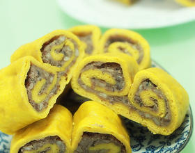 再从另一端卷起至中间位置,两个卷接触面抹些清水粘紧。两端分别粘紧口,盖湿布醒发20分钟