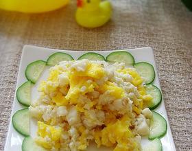 锅置火上油烧热,放入蛋清鱼肉,炒熟后盛出。