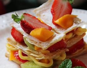 - 14. 取一块酥皮挤入卡仕达酱、加入水果,再挤上少量卡仕达酱。