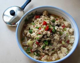 芹菜叶、红辣椒、蒜切碎,豆腐一会用铲铲几下就好了