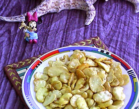 蚕豆可以选用发黄的老蚕豆也可以选尚带着青色的蚕豆,但不宜太嫩。油不宜多,但应该使每一片蚕豆瓣都裹上油。炸制时间应根据蚕豆的量相应增减。
