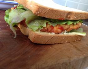 盖上一片生菜,然后放上鸡排,再挤番茄酱,然后再盖上一片生菜,最后盖上面包