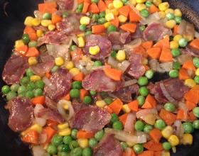 炒好辅料后,将辅料倒入淘好米的电饭煲内。