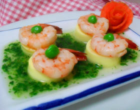 日本豆腐圆片上放虾仁,中间放一粒豌豆,摆盘蒸熟