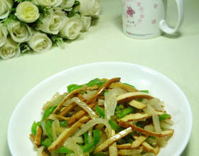 烧锅倒油烧热,下入切好的青椒和香干翻炒翻炒。