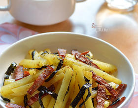 不时的翻动土豆条,煎至表面焦黄呈半透明状后放海苔