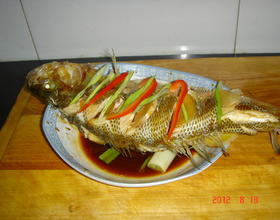 鲈鱼放入盘中,鱼身下架葱段、姜片。上锅大火蒸2分钟,揭开锅盖取出鱼盘倒出多余的汤汁(此汤汁最腥)上锅大火再复蒸2分钟即可。取出鲈鱼,撒上葱丝姜丝,浇上兑好的碗汁。另坐锅烧油至冒烟浇在鱼身上就可开餐。