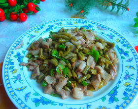 再倒进切好的咸豆角,辣椒丁,翻炒均匀,调入老抽翻炒片刻。