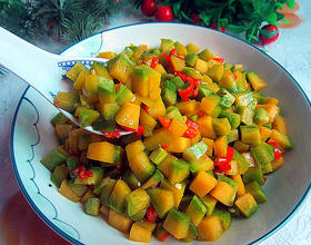 待南瓜稍熟时放进糖和辣椒丁提辣提色。