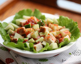 - 12. 将鸡脯肉, 黄瓜和桃子都切成小丁放入碗中;