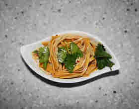- 6. 将干豆腐和沥干水份的金针菇入盘,上面放切好的香菜和蒜。