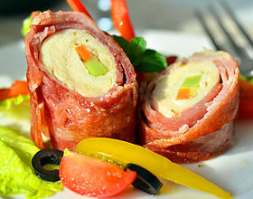 1、 百里香我用的是干的,量不要多一点点提味就好,没有也可以不放。2、 锡纸使用时要用亚光面接触食物。3、 装盘时除搭配色拉还可淋少许黑椒汁一起食用。4、 烤箱的温度请依自家烤箱调整,肉卷比较厚要烤熟烤透。
