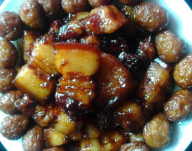 - 11. 将鹌鹑蛋摆放在盘子周围,再把肉盛进盘中即成。