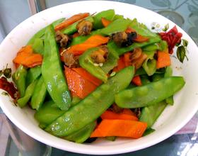 1、田螺肉用白醋、米酒、盐腌制下去腥味,可以再加蒜、姜腌制。同时可以入沸水烫下,那样炒的时候就不会出水分。2、荷兰豆比较容易熟,要大火快炒,不要炒太久,一面炒老变黄。3、荷兰豆绿油油的,配上胡萝卜颜色很好看,我没有再放生抽、老抽上色。如果你喜欢可以在炒田螺的时候放些酱油,随后炒田螺就不用放酱油了。