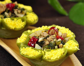 蒸好的窝头,蛋黄用筛子压蓉。装入窝头边,中间装菜即可。