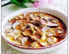 入蒸锅大火蒸至变熟后,摆上焯过水花蛤再蒸。