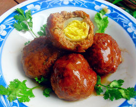 鹌鹑蛋煮后,剥去蛋壳。肉馅抓起来在两个手之间摔几下摁平,放一个鹌鹑蛋,再来回摔成光滑的圆型。