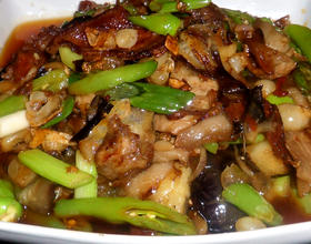 - 12. 把五花肉翻炒均匀上色,放入煎好的茄子,改大火翻炒入味。