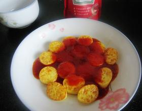 将调好的的番茄酱浇在煎好的日本豆腐上