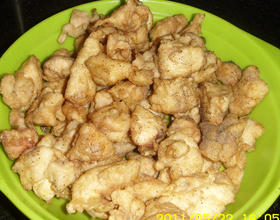 腌制入味的鸡丁。放入少许面粉和淀粉,拌匀,进行炸制。