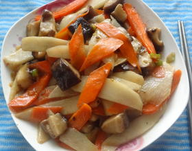 将胡萝卜、山药洗净,去皮切片,(山药放入盐水中浸泡,以免发黑),香菇洗净,切小块,切葱花备用。
