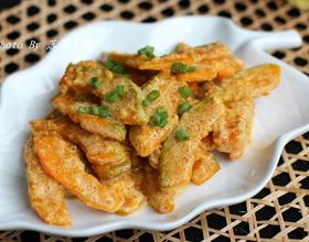 锅里放较多的油烧至七八成热,下入南瓜片炸一下捞出
