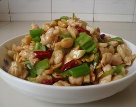 - 5. 放入炒好的鸡丁和青椒丁,翻炒。用水淀粉、白糖、生抽、盐、味精兑汁,烹入。