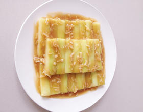 节瓜整齐摆在盘子里,撒上瑶柱丝。