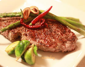 - 4. 牛排外的煎锅空位,我顺便利用了牛肉的肉汁煎上大蒜片和蔬菜。蔬菜不必加调味料了,肉汁里通通都有。