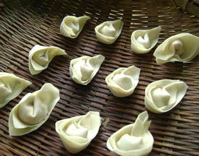 - 4. 取一张抄手皮,放适量的馅料在中间