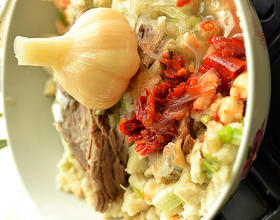 另一样必不可少的就是“糖蒜”这个绝对是所有人的最爱,无论是爱吃泡馍的西安人,或是不爱吃泡馍的朋友对甜甜的糖蒜都是欲罢不能,吃一口泡馍就上一口糖蒜不仅解油腻更是增加了舌尖的复合味道体验。