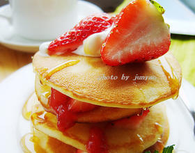 - 9. 最后将草莓切碎,少许淡奶油加糖打发,加草莓酱一起夹在两个叠起的松饼中间做内馅,也可以包着吃,最后上面用草莓和奶油略点缀,淋上蜂蜜