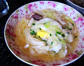 烧开后加入鸡蛋,鸡蛋定型后加入面条煮。