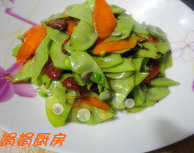 转大火,将扁豆和胡萝卜倒入锅内爆炒!加适量盐炒匀,待扁豆变透明色时加鸡精炒匀,准备出锅!~