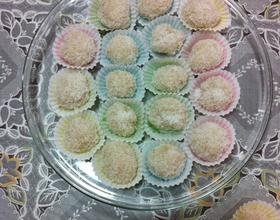 叮熟的糯米微凉,戴上一次性手套,手套上抹点香油,防粘,将糯米包上果肉,滚椰丝,就OK了