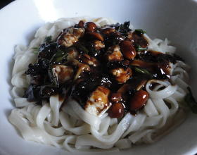煮沸面条好了以后,捞出面条。配上炸酱和可以根据你喜欢的配菜(焯熟的黄瓜丝、黄豆芽、胡萝卜丝)