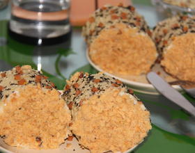 - 8. 拆开烤纸,切去两头,可切成四段,两边抹上沙拉酱蘸上肉松即可。