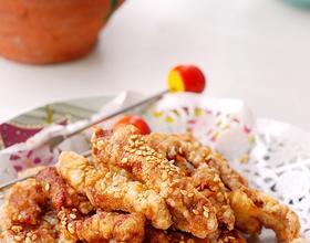 - 9. 捞出控油,趁热撒熟芝麻。食用时还可蘸番茄酱,味道极美,比鸡柳口感细腻。
