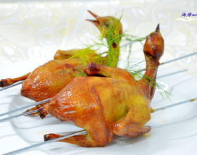 打开烤箱的旋转开关,让乳鸽边烤边旋转,这样烤出的颜色相对比较均匀。烤箱底部我垫了一张锡纸,这样可以接住滴下来的油,省去清洗烤箱的烦恼。