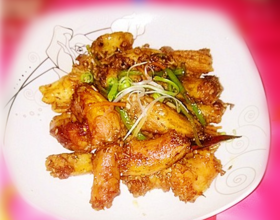 - 9. 将孜然炒出味道后放入葱花翻炒片刻,将鸡脖倒入锅中,迅速翻炒一分钟,放入少量盐。
