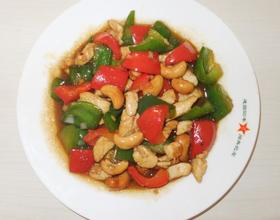 炒锅放油,放入鸡肉丁、腰果、菜椒丁一同煸炒。