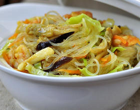 1,蔬菜不要炒久,翻均匀就可以。我后来想韭黄是不是最后放比较好。下回试试。 2,换成那种和龙口粉丝差不多的细米粉,当饭吃,也是相当好吃! 3,煮粉丝的时候全程大火。所有食材都不要煮时间长。要粉丝软而不腻,是需要好好掌握水量和泡之前的程度的。就和做其他粉丝菜一样就可以。 4,没有高汤就用水兑鸡精或者高汤精吧。或者干脆就用清水。 5,原菜里有海参,我没买到所以没放,用了香菇的黑色。