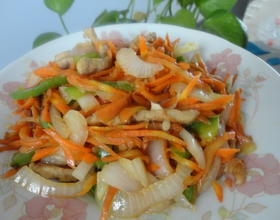 先放入胡萝卜丝多炒一会儿 炒出红油 味道更佳