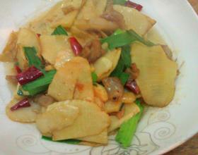 放干椒爆一下,倒入焯过水的冬笋片翻抄。(家人不吃很辣的菜,干椒我没有爆炒
