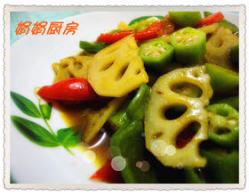 - 9. 将焯好水的藕片、青红椒和秋葵倒入锅中炒匀。让咖喱汁充份的裸在藕片上。