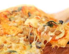 牛肉粒罗勒披萨原料:面团:高筋面粉600克、水360克、酵母6克、细砂糖30克、盐5克、橄榄油25克、馅料:味美好披萨酱80克、口蘑100克、黑橄榄6个、荷美尔牛肉粒100克、鲜罗勒叶适量、黑胡椒粒适量、乳酪丝150克